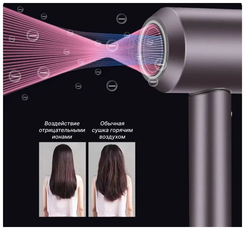 Для идеальной укладки нужно подобрать настройки для своего типа волос. Вы можете выбрать одну из трёх скоростей, а температура варьируется от 28 до 100 градусов. Плюс, есть функция ионизации, которая убирает статику, и волосы не пушатся.