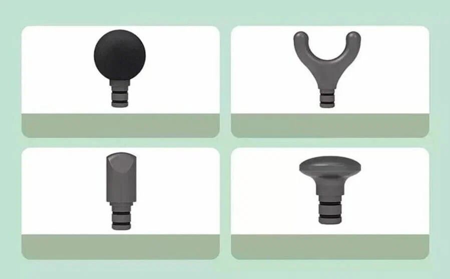 В комплекте предусмотрен кейс для транспортировки и 4 сменные массажные головки: 1. Шаровая головка подходит для груди, спины, ягодиц и т. д. 2. Двойная насадка подходит для сухожилий шеи, стоп и т. д. 3. Грибовидная головка подходит для расслабляющего массажа мышц. 4. Головка-«пуля» подходит для ладоней, пальцев, стоп и т. д.