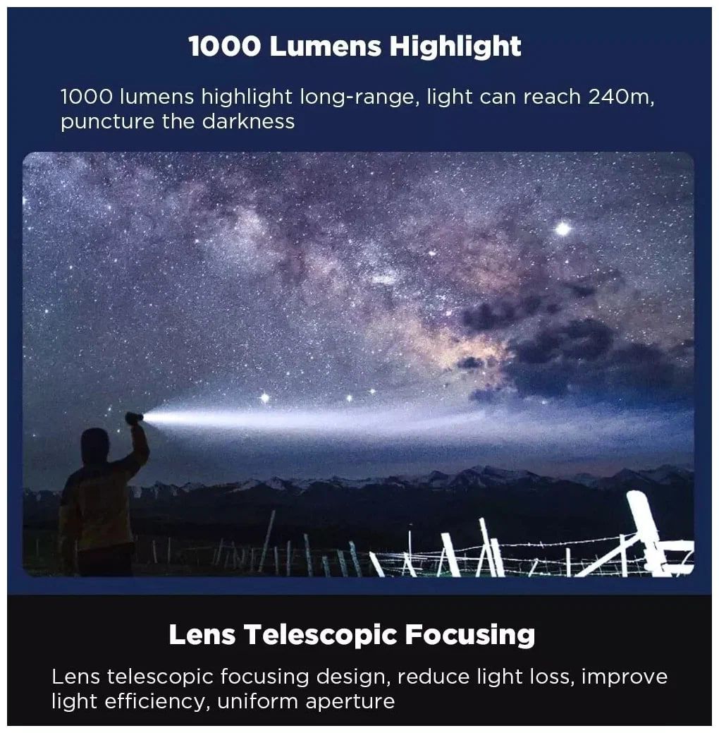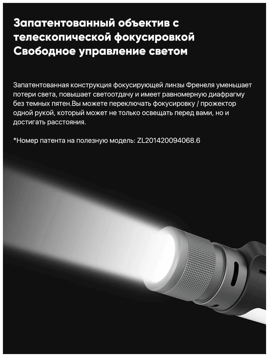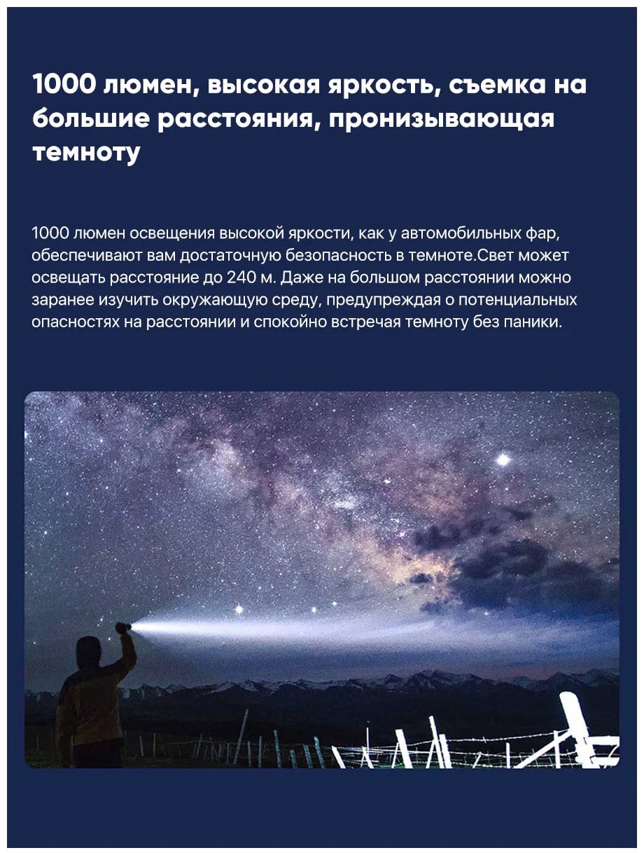 Многофункциональный фонарик с максимальной дальностью светового потока 240 метров и максимальной яркостью 1000 люменов. Фонарик снабжен литий-ионным аккумулятором емкостью 2600 мАч, который может служить зарядным устройством для телефонов и других электронных устройств. Он выручит вас в темное время суток, на природе, или, если ваш дом останется без электричества.