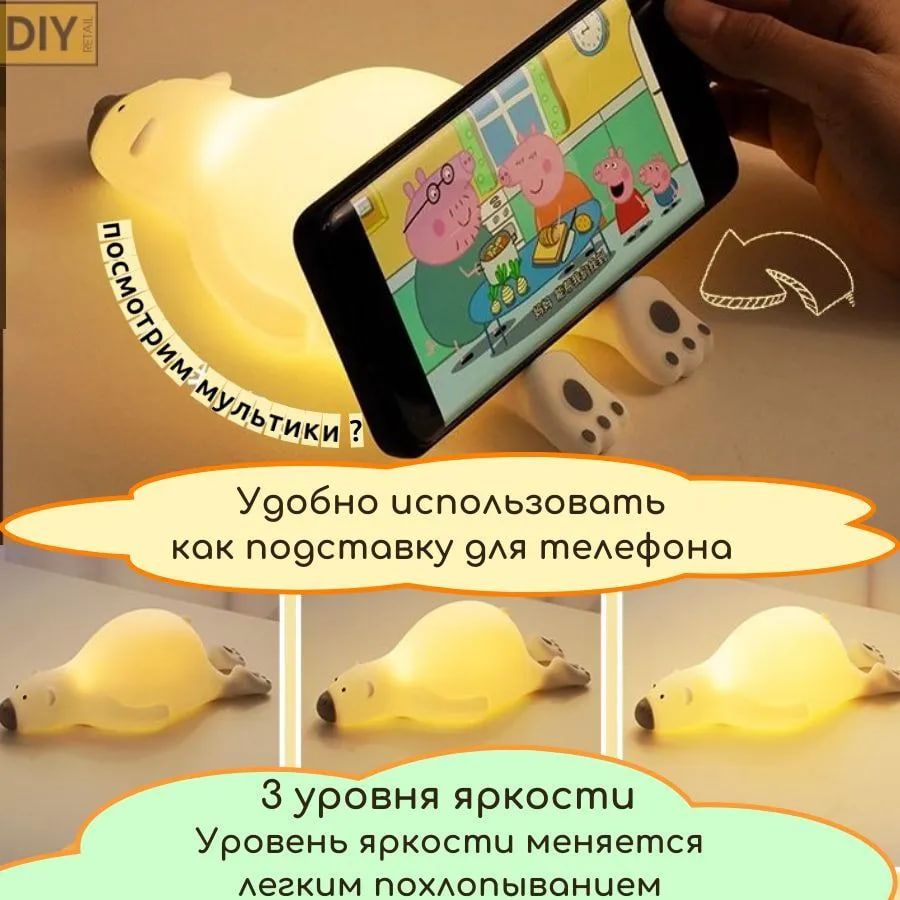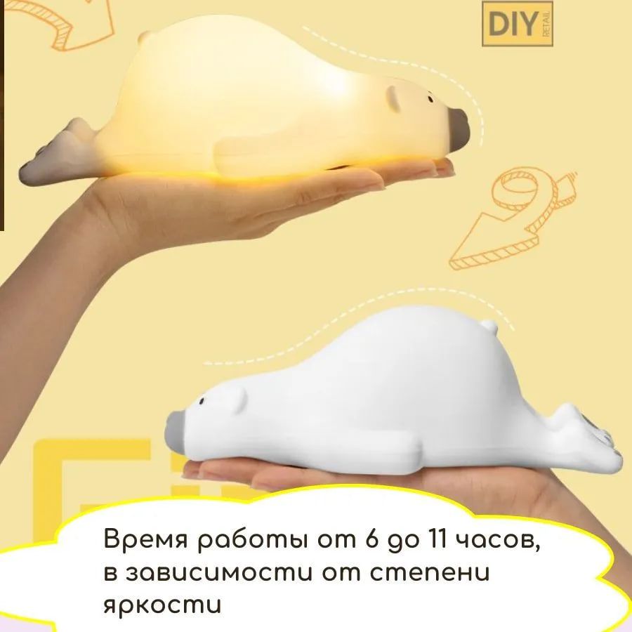Беспроводной уникальный силиконовый ночник в форме забавного персонажа "Медвежонок" размером 90х89х102 мм придется по душе каждому ребенку и даже взрослому! Мягкий и приятный на ощупь ночник станет самой любимой игрушкой и главным источником света ночью. Такой оригинальный вариант ночника абсолютно безопасен, поскольку изделие не имеет острых мелких деталей и запаха, не нагревается. Ночник располагает 3 режимами: теплое свечение, плавная смена цветов, свечение одним из 8 цветов (RGB). Смена режима работы производится легким хлопком по светильнику. Устройство оборудовано кнопкой вкл/выкл и батарейным отсеком. Для экономии электроэнергии автоматически выключается через 1 час работы. Питание осуществляется от батареек 3*ААА (не в комплекте). Изделие предназначено для пользования внутри помещения или под навесом (от - 20 до + 40 градусов).