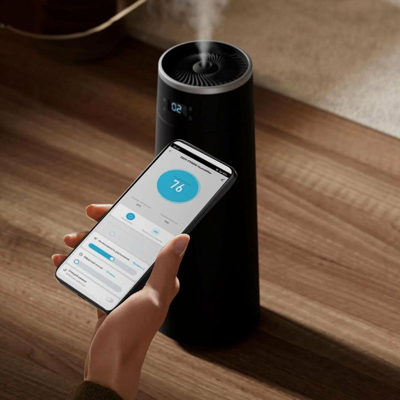 DEERMA DEM-F950W оснащен гигростатом, который позволяет поддерживать оптимальную влажность в помещении. Индикаторы влажности и температуры на дисплее помогут вам контролировать состояние воздуха в комнате.