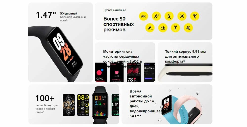 Xiaomi Smart Band 8 Active Black M2302B1 (BHR7422GL) (фитнес-браслет, 1.47", TFT, Bluetooth 5.1, Mi Fit, iOS/Android, собщение мессенджеров, входящие звонки, вибросигнал, измерение пульса, контроль уровня стресса, датчик насыщения крови кислородом, определяет насыщение крови кислородом, мониторинг сна, шагомер, 50 спортивных режимов, сожженных калорий, оценка индекса PAI, нет поддержки бесконтактных платежей, влагозащита по стандарту WR50 [5 атм], черный, корпус из пластика, ремешок черного цвета, из силикона, 210 mAh, фирменный кабель, до 9 дней, 20 гр)