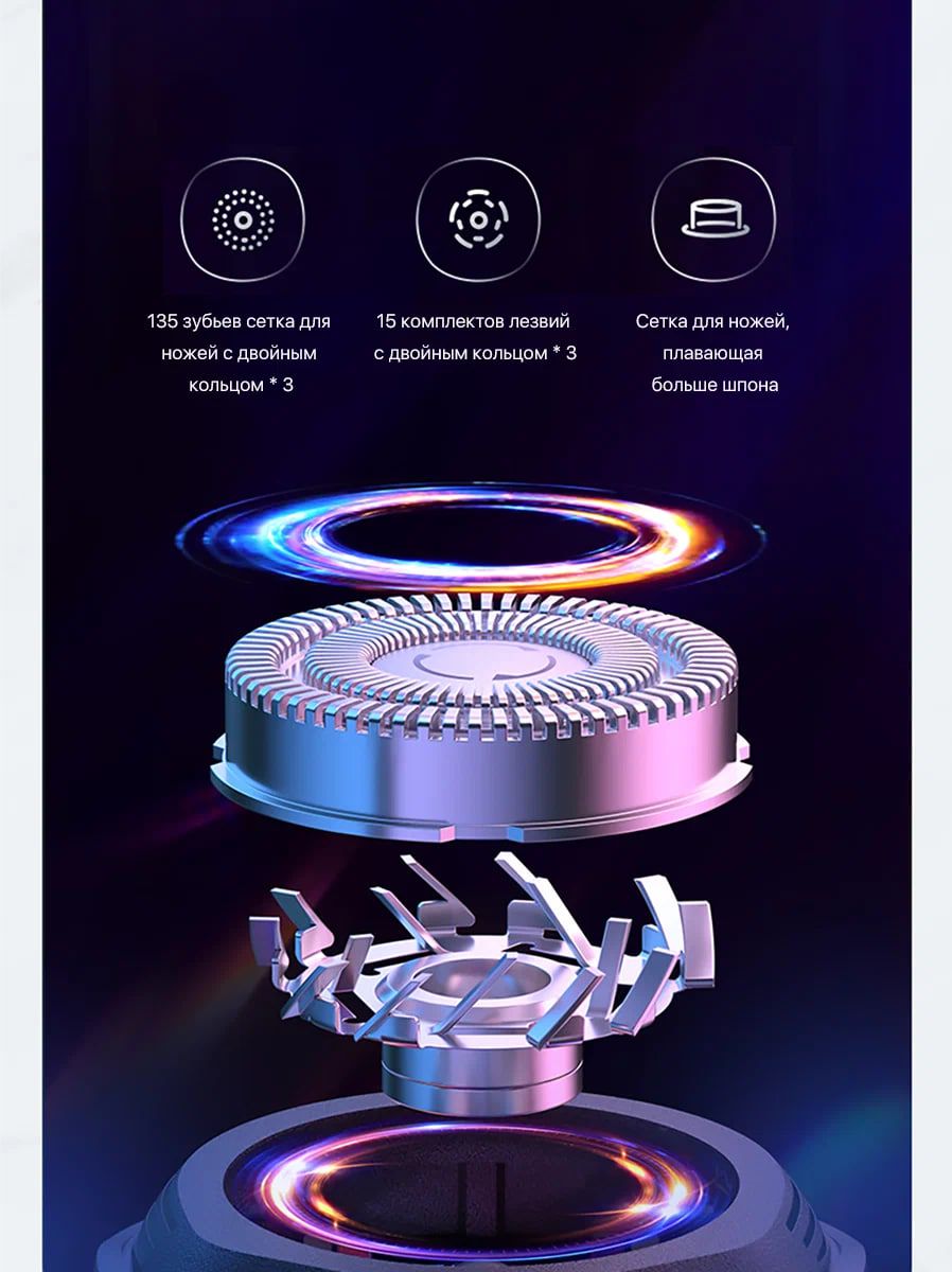 Эргономичный дизайнЭлектробритва ShowSee F1-BK имеет вертикальную конструкцию, цилиндрическую форму корпуса и дополнена матовым покрытием. Ее удобно держать в руке, ведь она имеет размеры 16.5 x 5.5 x 3.42 см и весит при этом около 155 г. 3 острые плавающие головкиЭлектробритва ShowSee F1-BK оборудована тремя плавающими головками, обеспечивающими гладкое и приятное для кожи лица бритье. В то же время, что касается материала, она изготовлена из импортированной немецкой Seiko стали Thyssen Kehuber, в сочетании с технологией электрохимической обработки ECM, что делает режущую головку более острой. Ультратонкая сетка для ножей с двойным кольцом спроектирована так, чтобы быть более удобной в использовании. Ее независимая, вращающаяся во всех направлениях структура на 360°, может не только увеличить площадь охвата, но и тщательно сбривать волоски под подбородком, на шее и т. д. Съемная конструкцияВ сочетании с конструкцией съемной режущей головки и режущей сетки, бритву ShowSee F1-BK удобнее чистить после каждого процесса бритья. При этом рекомендуется промывать под проточной водой исключительно головку бритвы. Интуитивно понятное управлениеВ центральной части корпуса электробритвы находится кнопка включения. Чтобы снять блокировку, необходимо удерживать кнопку управления нажатой в течение 3 секунд. Такой подход позволит исключить случайное включение электробритвы в сумке или чемодане. До 90 минут работы без подзарядкиВ нижней части корпуса находится Type-C разъем. Для зарядки встроенного аккумулятора емкостью 800 мАч, потребуется около 1.5 часов времени, после чего вы сможете использовать электробритву приблизительно 90 минут. Кроме того, если аккумулятор полностью разряжен, а вам необходимо срочно побриться перед деловой встречей или поездкой, то можете воспользоваться 3-минутной быстрой зарядкой для 3-х минутного бритья. Высокоскоростной моторОборудованная высокоскоростным двигателем с функцией подавления вибрации и шума, ShowSee F1-BK может обеспечить высокую скорость 2900 об/мин, в сочетании со сниженным показателем вибрации и шума, который составляет всего 65 децибел. Интеллектуальный контроль мощностиВ то же время электробритва оснащена интеллектуальной системой постоянной мощности, которая может автоматически регулироваться в реальном времени, дабы поддерживать постоянную скорость лезвия и надлежащую силу бритья.