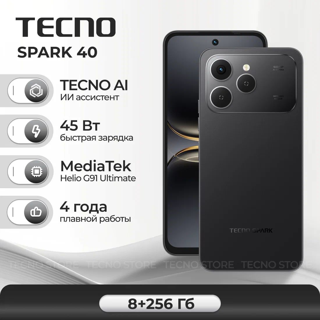 TECNO Spark 40 — надёжный смартфон со сбалансированными характеристиками для ценителей стильного дизайна.